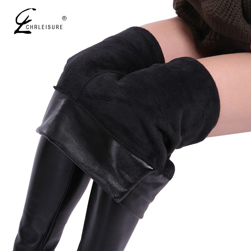 Winter Leather Leggings Women High Waist Warm Black Leggins